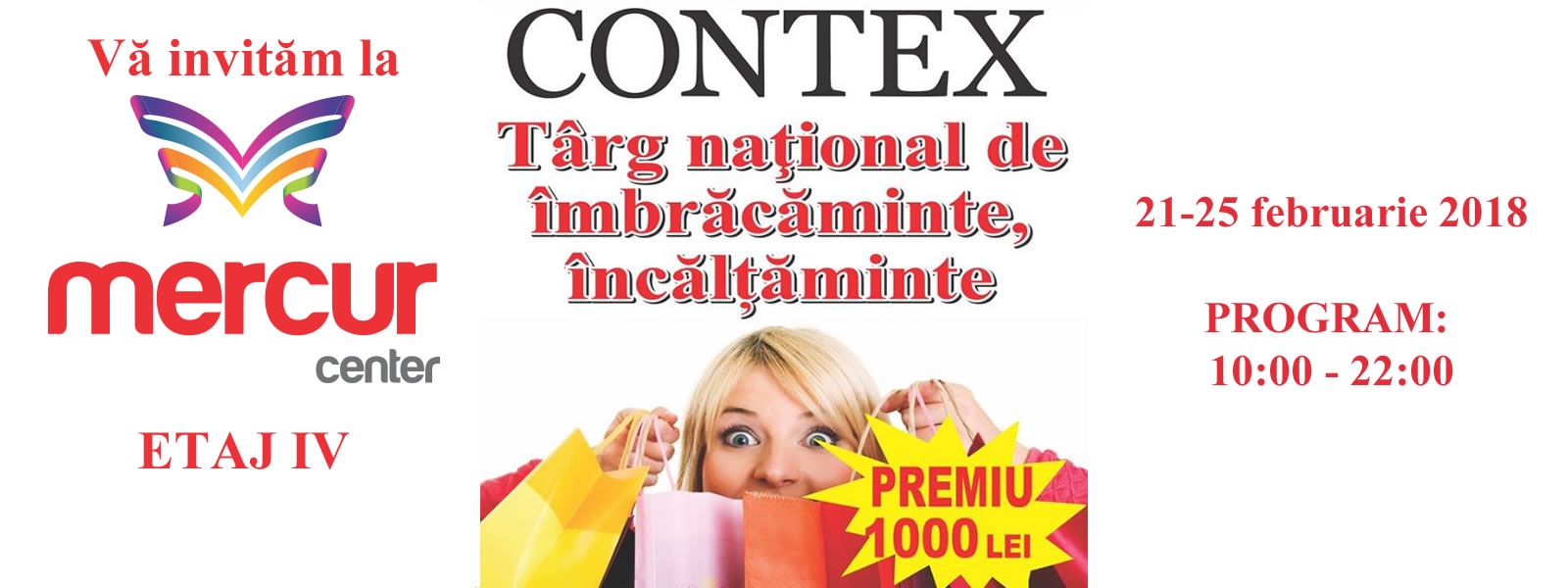 CONTEX cel mai important târg de îmbrăcăminte, încălţăminte, tricotaje, articole pentru copii, marochinărie, piele, blană, artizanat şi hande made, organizat de Camera de Comerţ şi Industrie Dolj se va desfăşura în perioada 21-25 Februarie, în Mercur Center, etaj 4.