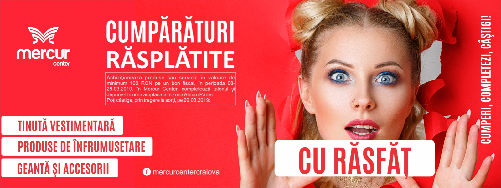 Dacă faci cumpărături în Mercur Center, de minimum 100 RON pe un bon fiscal, până pe 28 martie 2019, poţi câştiga prin tragere la sorţi: ţinută vestimentară, geantă, accesorii şi alte premii surpriză.