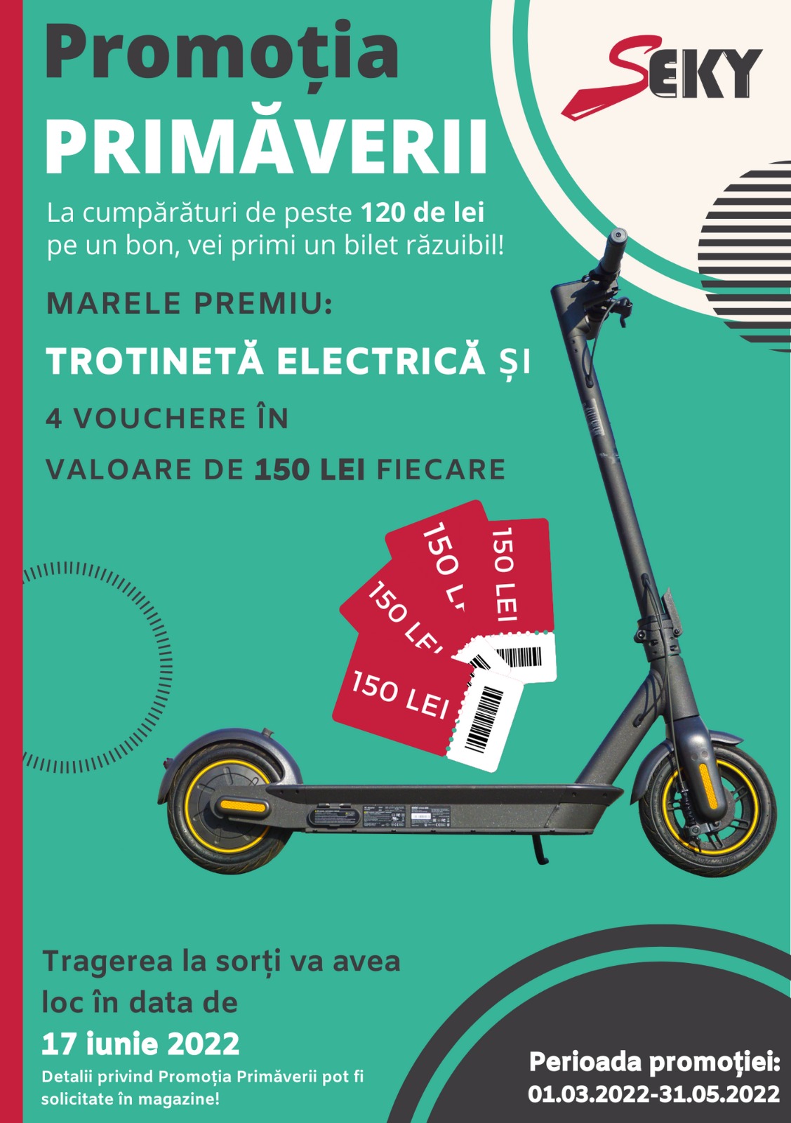 Primăvara aduce surprize de la Seky! Ca să te bucuri și mai mult de acest minunat anotimp, Seky ți-a pregătit un concurs de neratat. Pana pe 31 martie haide în magazinul Seky din Mercur Center, achiziționează produse în valoare de 120 de lei pe un bon și primești un bilet răzuibil cu care ai șansa de a câștiga pe loc. Promoția nu se încheie aici! Toți posesorii unor tombole vor participa la marea extragere din data de 17 iunie!‼ Marele premiu: o trotinetă electrică și patru vouchere a câte 150 de lei fiecare! Pentru informații suplimentare solicitați informații în magazin! Mult succes!