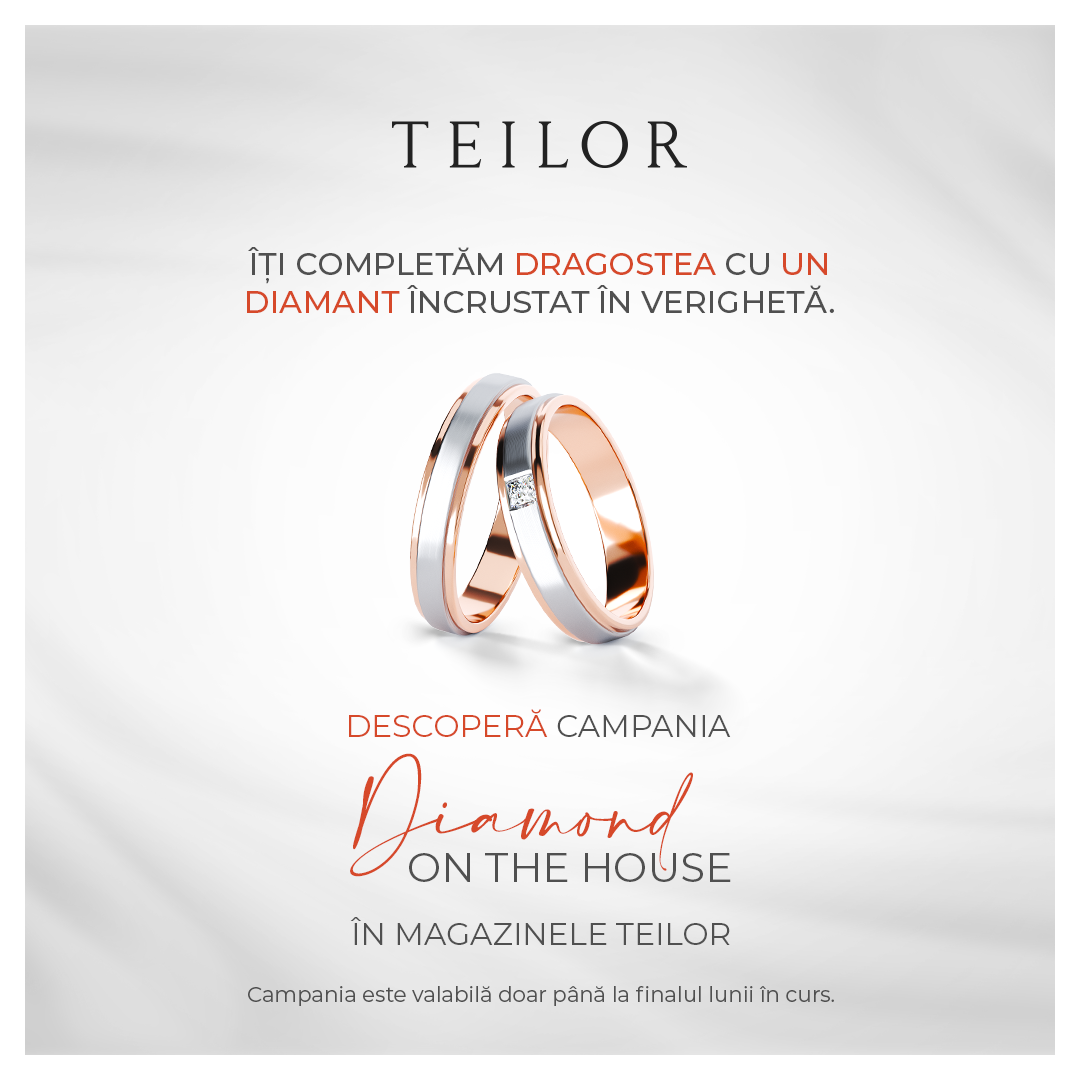 Daca achiziționezi un set de verighete TEILOR, vei primi un diamant încrustat în una dintre ele, iar caratul pietrei prețioase va fi stabilit în funcție de valoarea produsului.