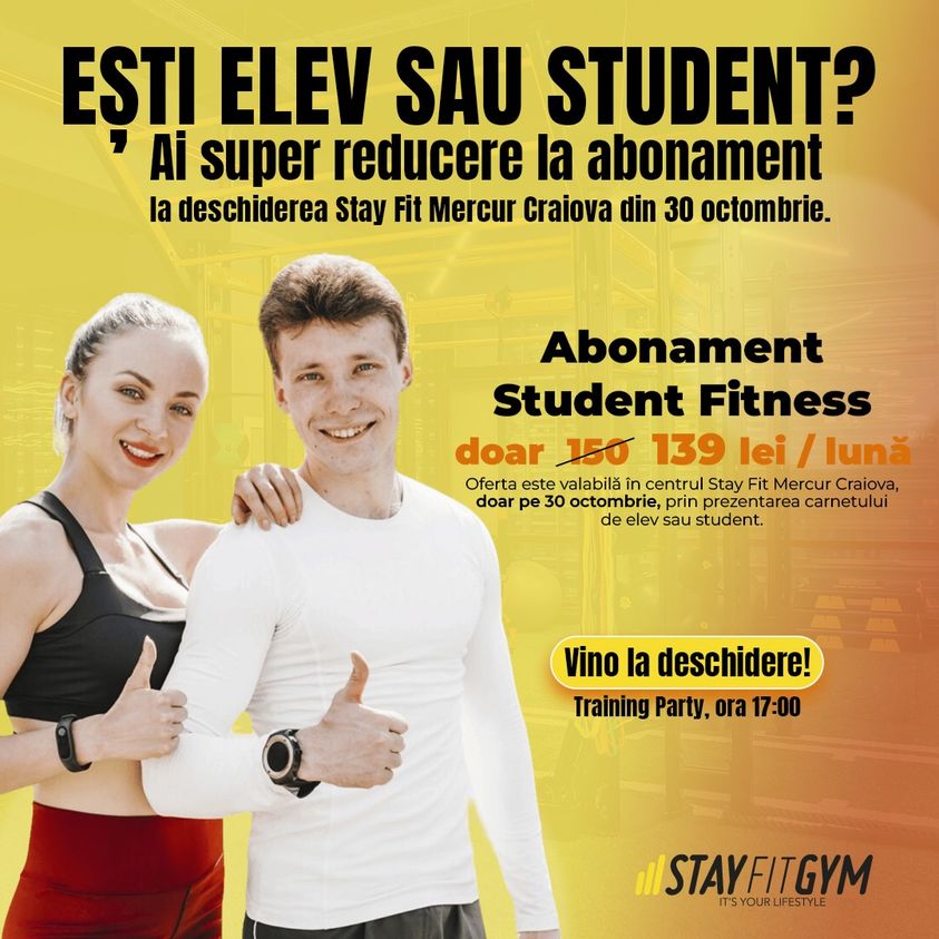 La marea deschidere Stay Fit Mercur Center din Craiova elevii și studenții pot profita de o ofertă unică. Ia-ți abonamentul Student Fitness la doar 139 lei/lună! Oferta e valabilă doar în ziua inaugurării. Te așteptăm la training party, pe 30 octombrie, de la ora 17:00!