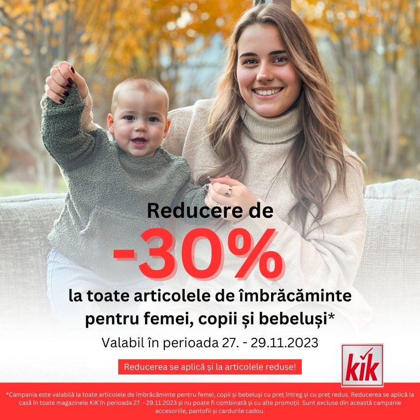 Între 27 și 29 noiembrie te poți bucura de 30% reducere la articolele de îmbrăcăminte pentru femei, copii și bebeluși.