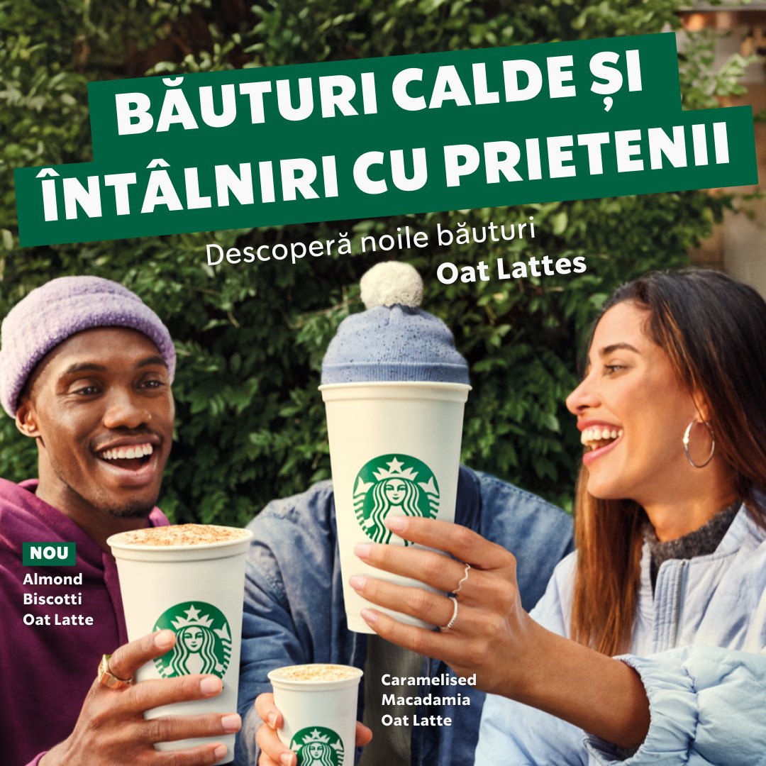 Caramelised Macadamia Oat Latte se reîntoarce să-ți încălzească zilele friguroase de iarnă. Și nu a venit singur, Almond Biscotti Oat Latte e și el aici! Hai la Starbucks să le încerci!