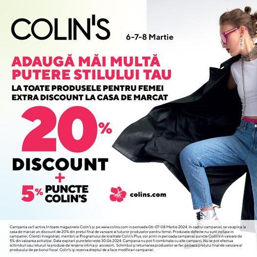 Special de Ziua Internațională a Femeii, în perioada 6-8 Martie ai o ofertă de neratat! La toate produsele de damă primești un discount de 20% instant, la casa de marcat! Pe lângă asta, primești și 5% puncte Colin’s cadou în contul tău!