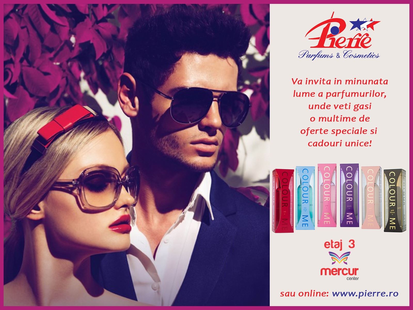 Pierre Parfums & Cosmetics vă invită în Mercur Center-etajul 3, în minunata lume a parfumurilor, unde veţi găsi o mulţime de oferte special şi cadouri unice!