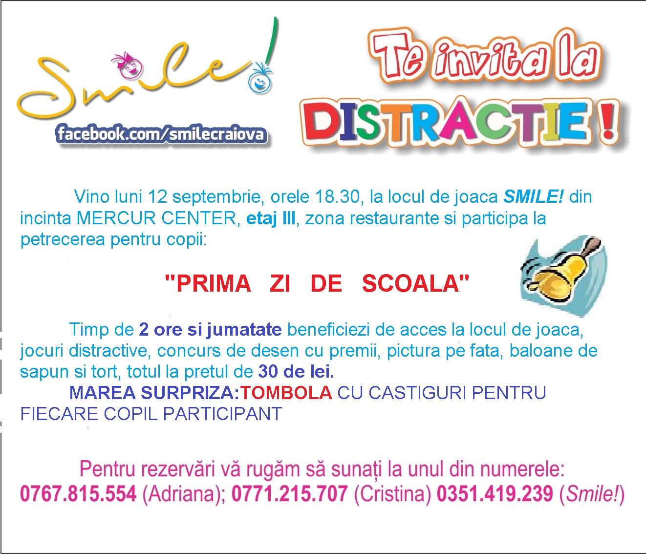 Smile! te invita luni, 12 septembrie, la petrecerea pentru copiii: ”PRIMA ZI DE SCOALĂ!” Vă aşteptăm la locul de joacă SMILE, din MERCUR CENTER, etajul 3!