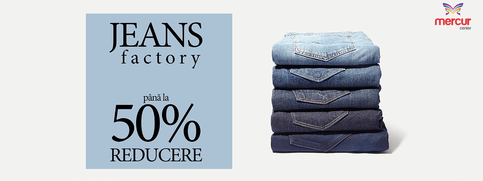 Start la reduceri de până la 50%, la Jeans Factory, în Mercur Center: pantaloni Denim, la 95 lei, 75 lei si 50 lei.