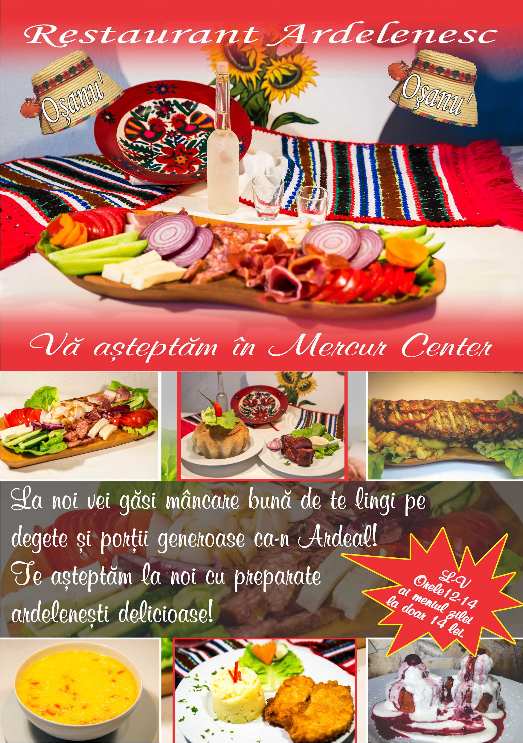 Vă aşteptăm în Mercur Center, la etajul 3- SKY CITY CENTER- la Restaurantul ardelenesc “Oşanu” cu produse specifice sezonului şi mâncăruri tradiţionale într-o atmosferă destinsă şi primitoare!