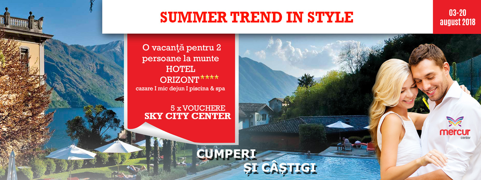 Ești pregătit pentru o vară de neuitat cu premii pe măsură? Mercur Center te trimite în vacanță! Nu trebuie să te mai gândești la vreme, îți oferim o vacanță în Predeal, la hotel de 4****, cu mic dejun inclus, acces la piscină interioară, centru SPA și sală de fitness! În plus, poți câștiga 5 x vouchere în valoare de 50 lei în Sky City Center.