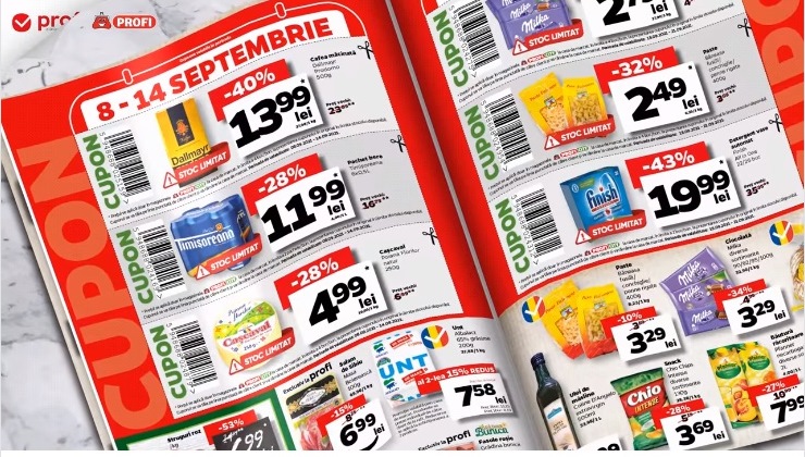 Avem vești bune pentru tine! De astazi găsești revistele cu noile oferte ale domnului Cuponescu în magazinul PROFI din Mercur Center, valabile între 8 - 21 septembrie. Cupoanele de reducere se află pe 2 pagini separate, astfel încât să poți beneficia de toate timp de 2 săptămâni: în perioada 8 - 14 septembrie și 15 - 21 septembrie. Cumpără de minimum 35 de lei și primești la casă revista cu cupoane.
