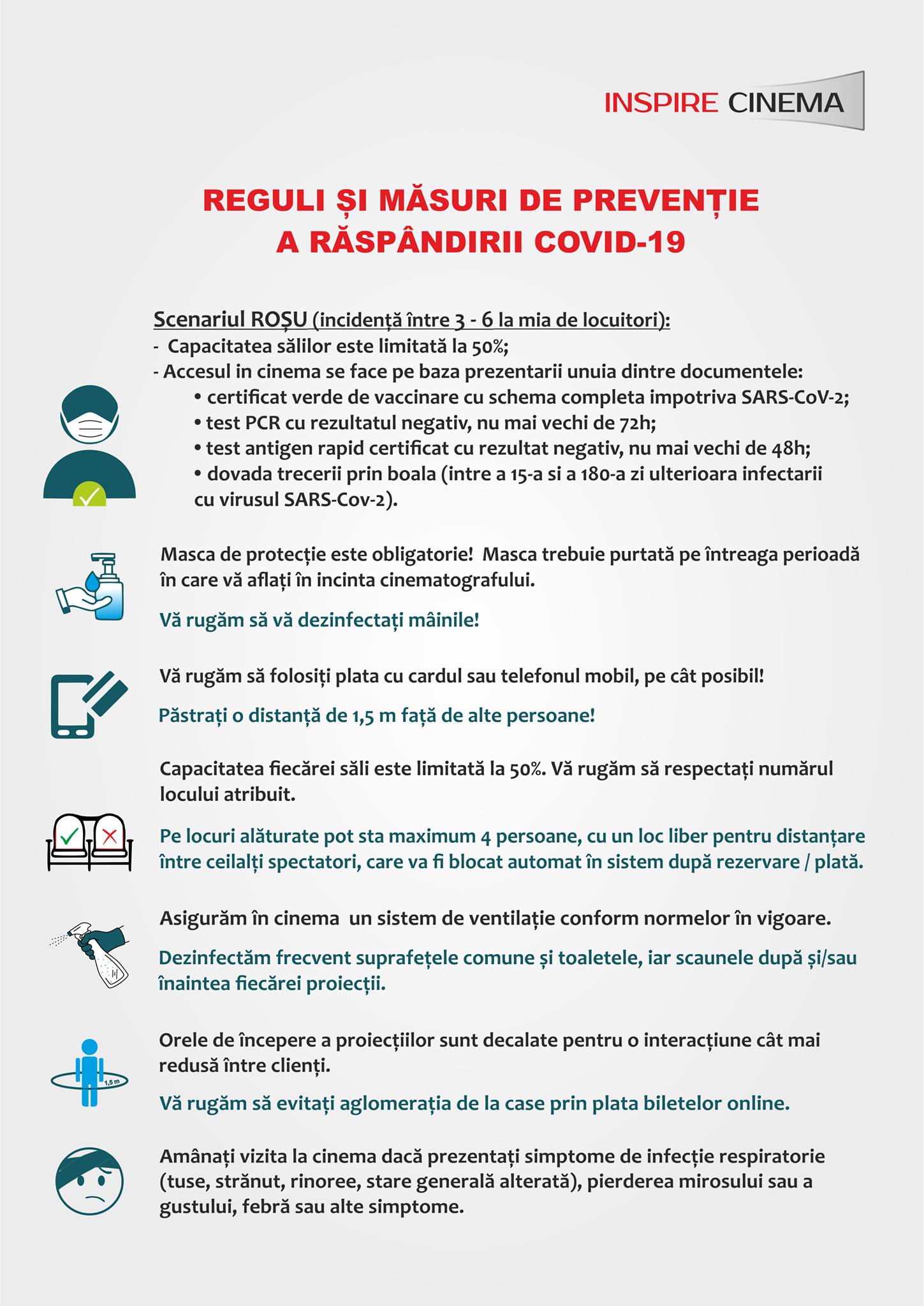 Având în vedere noile restricții impuse de către autorități, începand de joi, 23 septembrie, accesul în locația Inspire Cinema din Mercur Center se va face doar prezentând un certificat de vaccin, un test Covid negativ sau dovada trecerii prin boala.