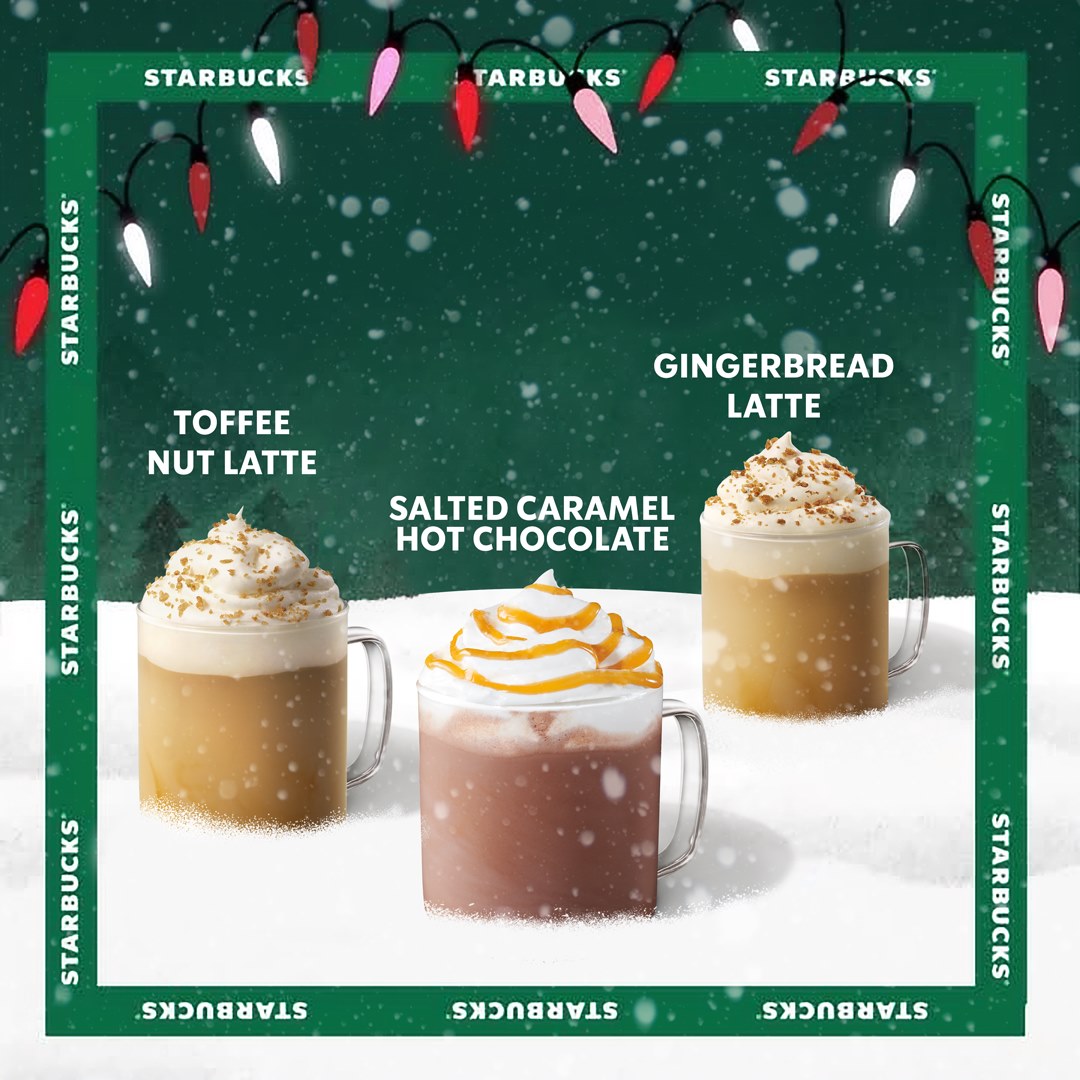 Între 2 și 8 noiembrie, Toffee Nut Latte, Gingerbread Latte și Salted Caramel Hot Chocolate sunt gata de gustat pentru membrii Starbucks Rewards. Merry (almost) Christmas! 🌟